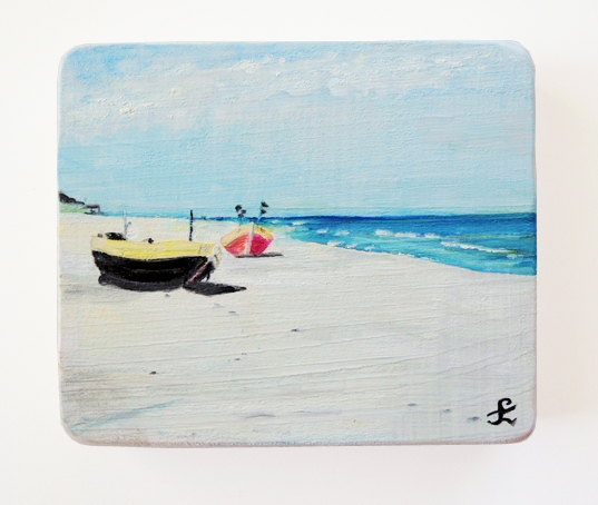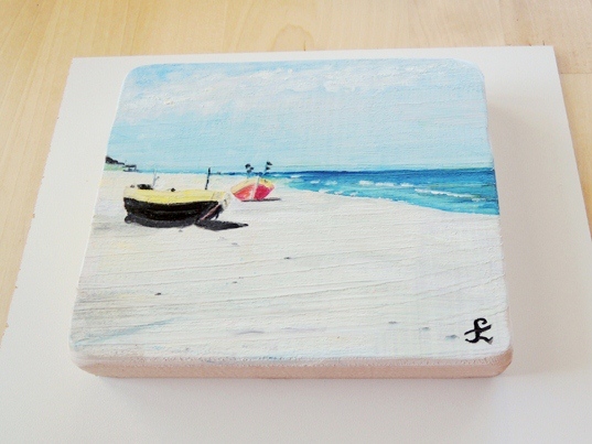 41 Drewniany Obrazek Pocztówka - Łódki na Plaży