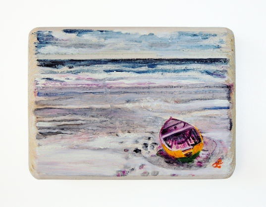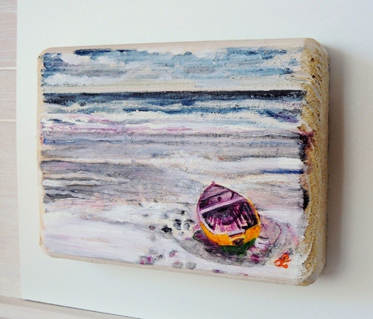 61 Drewniany Obrazek Pocztówka - Łódka na Plaży
