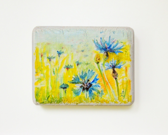 Obrazek olejny namalowany na drewnie sosnowym.