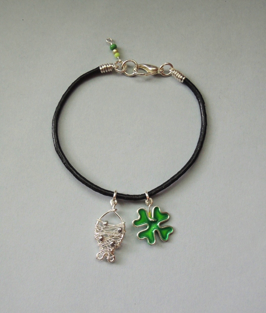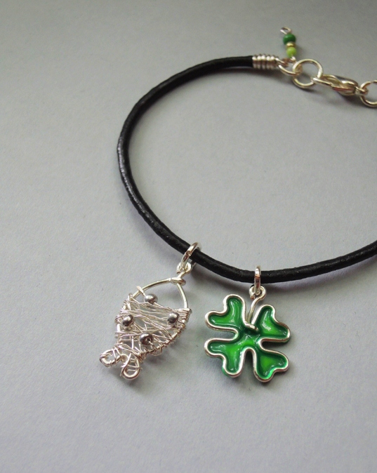Bransoletka jest zaskakująco lekka, prawie niewyczuwalna podczas noszenia! Może stanowić komplet z kolczykami koniczynkami lub zawieszką koniczynką – klik! Rybki takie jak w bransoletce występują również w formie klipsów lub kolczyków (kliknij tutaj :)