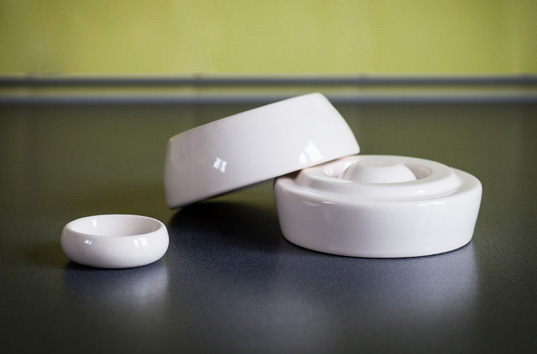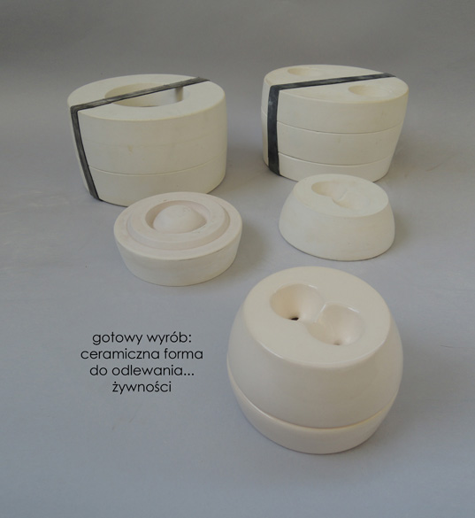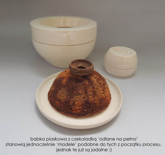 Pomysł na realizację ceramicznych form do odlewania żywności powstał z fascynacji elementem technologii produkcji ceramiki czyli formą gipsową. Ten niepozorny obiekt o prostym geometrycznym kształcie kryje wewnątrz tajemnicę. To właśnie niewiadoma wewnątrz formy, widoczna dopiero po jej otwarciu stała się inspiracją dla działania projektowego, którego celem było stworzenie nowego kontekstu, w jakim forma mogłaby okazać się równie funkcjonalna jak w pracowni ceramiki.