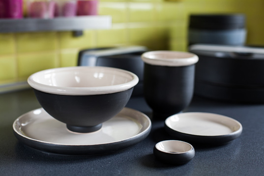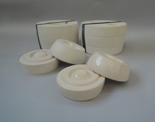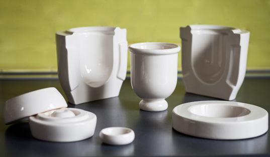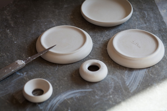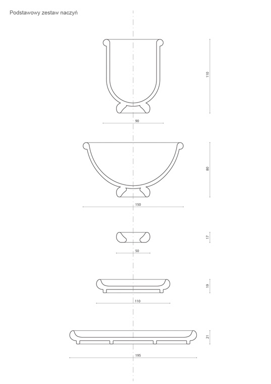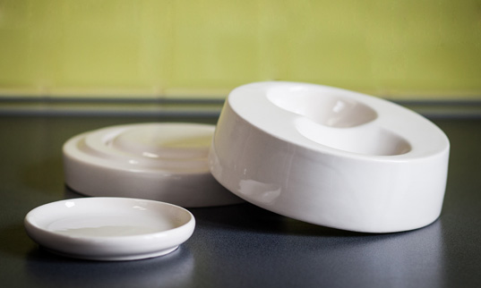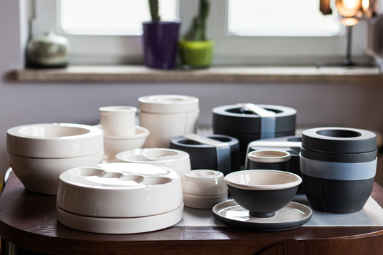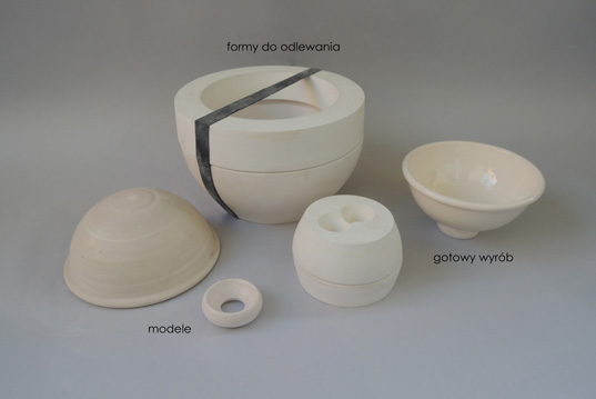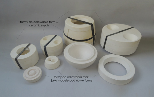 Punktem wyjścia był podstawowy zestaw naczyń śniadaniowych: kubek, miska, duży talerz, mały talerz i stojak na jajko oraz formy, z którego naczynia te odlewałam. Następnie postanowiłam zrobić eksperyment i potraktować formę gipsową jako model. Z tego modelu zdjęłam formę, aby z niej następnie odlewać formy ceramiczne, których kształt był zdeterminowany przez bryły form gipsowych do odlewania naczyń. Uproszczając – kiedy tworzy się formę gipsową, określa się to jako “zdjęcie formy z modelu”.
