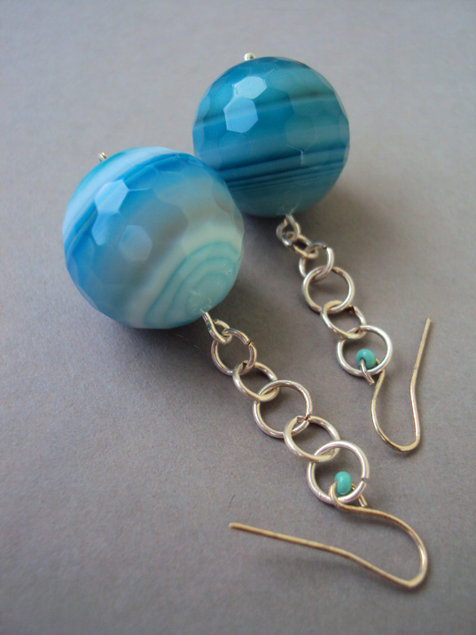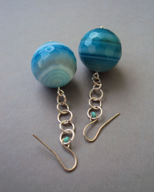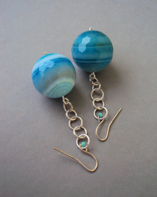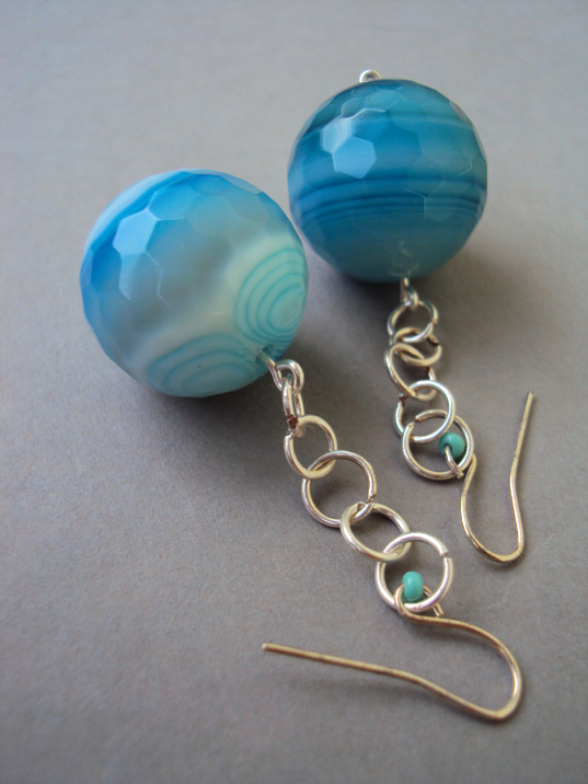 Unikatowa biżuteria wykonana od podstaw ręcznie autorską techniką łączoną z wire-wrapping. Kamienie jakich użyłam do wykonania tych kolczyków to piękne błękitne agaty, duże wielościenne kule fasetowane.