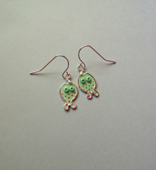 Kolczyki są zaskakująco lekkie, prawie niewyczuwalne podczas noszenia. Mogą stanowić komplet z bransoletką z rybką seledynową lub z bransoletką z trzema rybkami :)