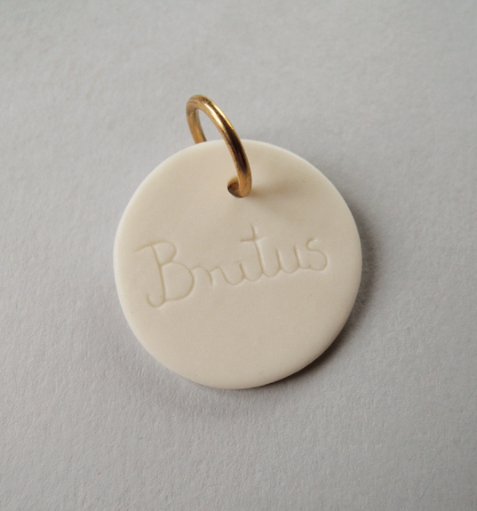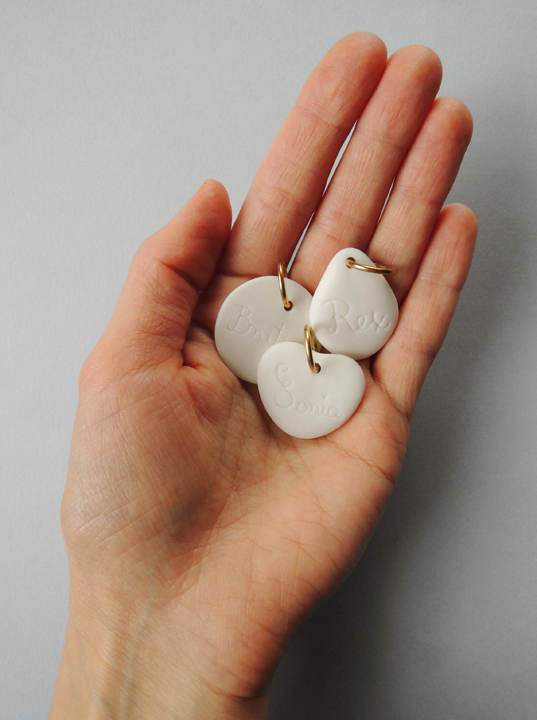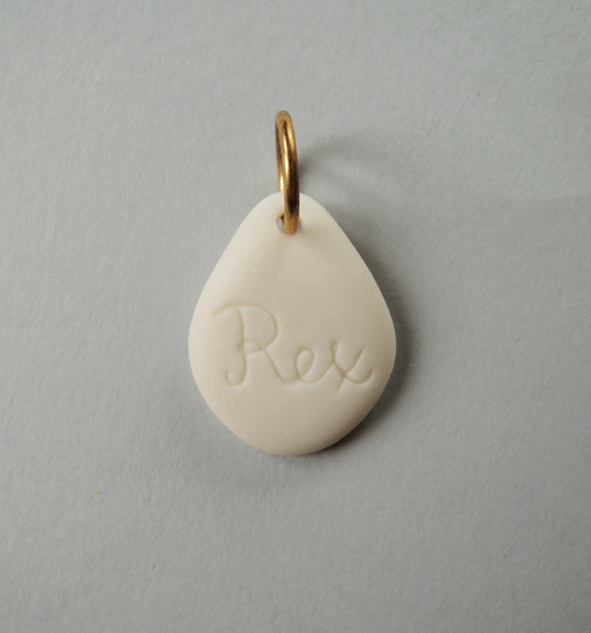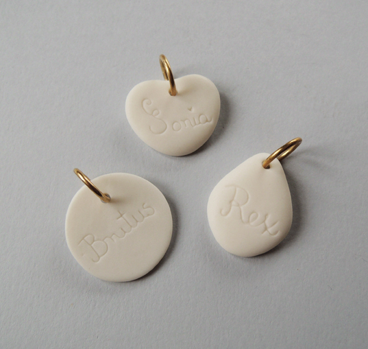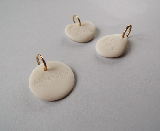 Nieco eksperymentalny projekt identyfikatorów na obrożę dla psa lub kota. Zdjęcia przedstawiają przykładowe realizacje – docelowo każda sztuka wymaga indywidualnego wykonania ze względu na potrzebę wykonania napisu na identyfikatorze przed wypaleniem porcelany.