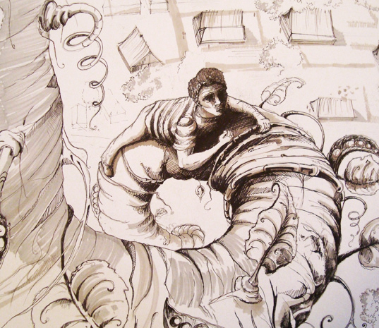 Rysunek wykonany w technice łączonej: cienkopis, długopis i flamaster.