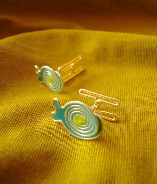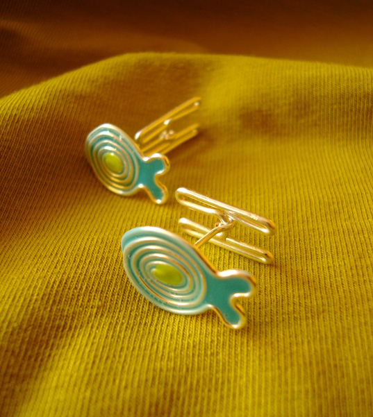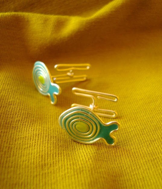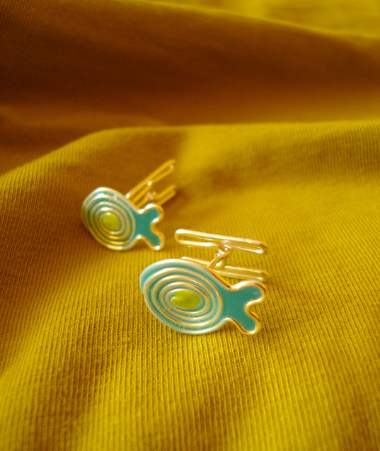 Unikatowa biżuteria wykonana od podstaw ręcznie autorską techniką łączoną z wire-wrapping. Wzór przedstawia pierwszą próbę wykonania spinek do mankietów – sam mechanizm również wykonany ręcznie – docelowo realizuję z gotowymi zapięciami, które okazały się bardziej funkcjonalne.